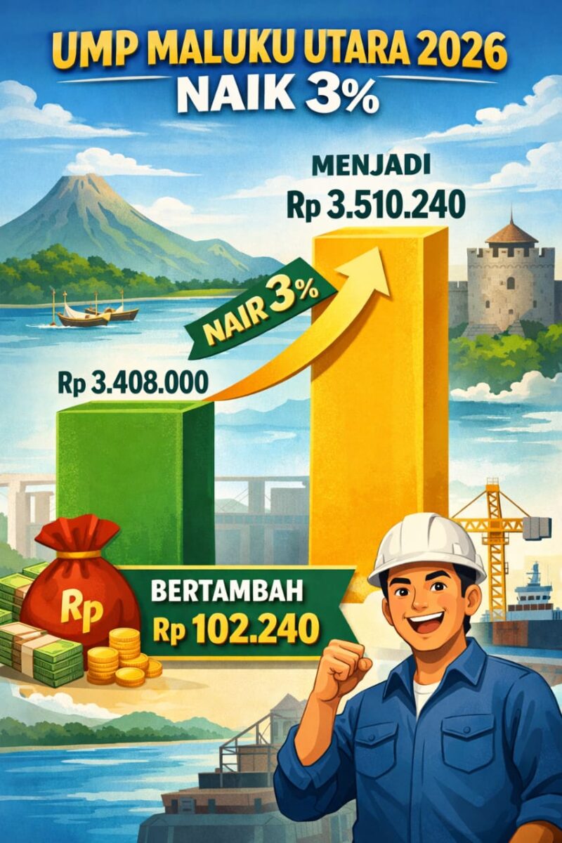 SOFIFI – Pemerintah Provinsi Maluku Utara resmi menetapkan Upah Minimum Provinsi (UMP) tahun 2026 mengalami kenaikan sebesar 3 persen dari tahun sebelumnya. Dengan penetapan tersebut, UMP Maluku Utara naik dari Rp3.408.000 menjadi Rp3.510.240, atau bertambah Rp102.240.